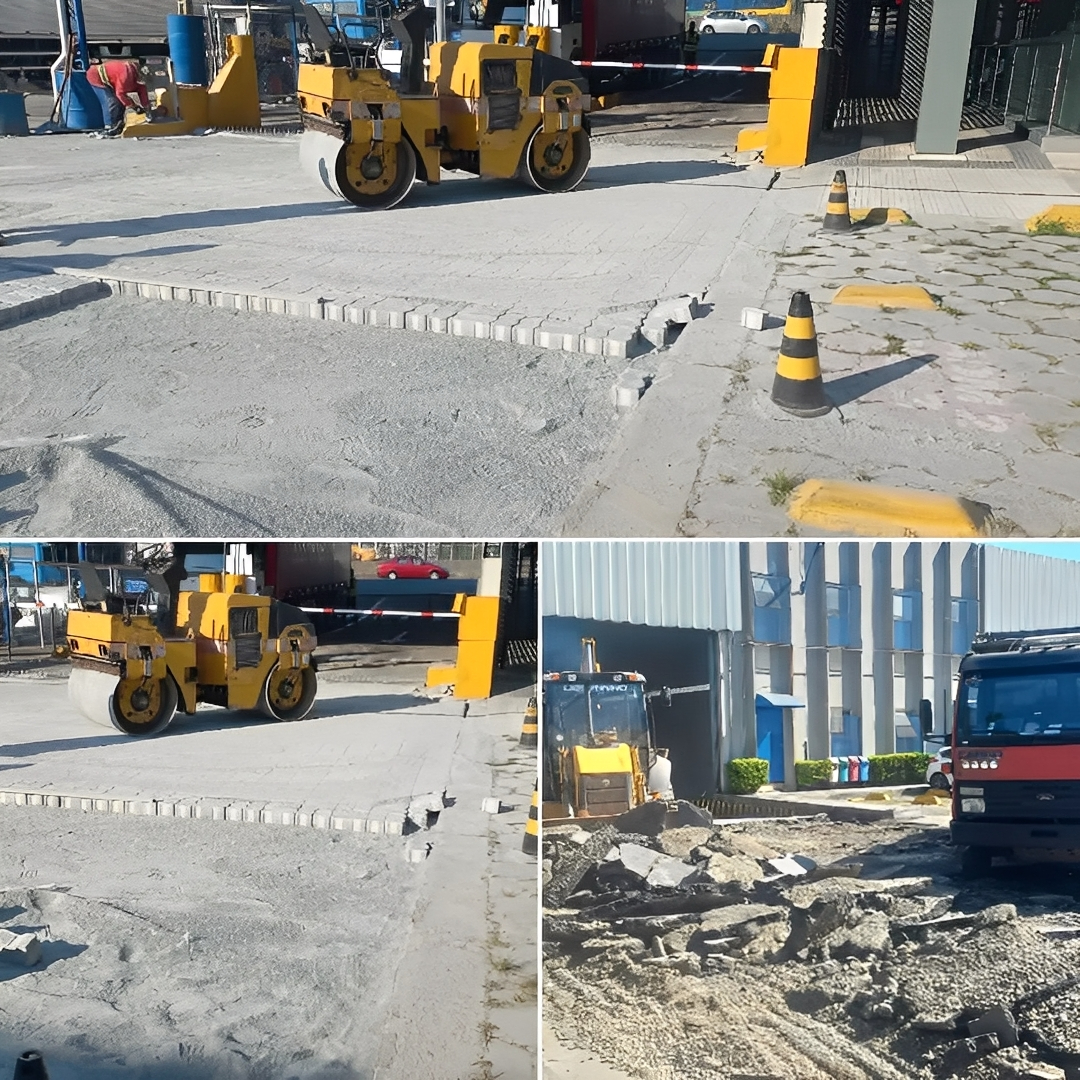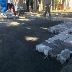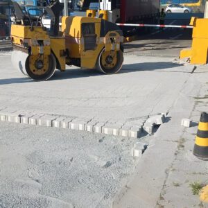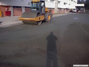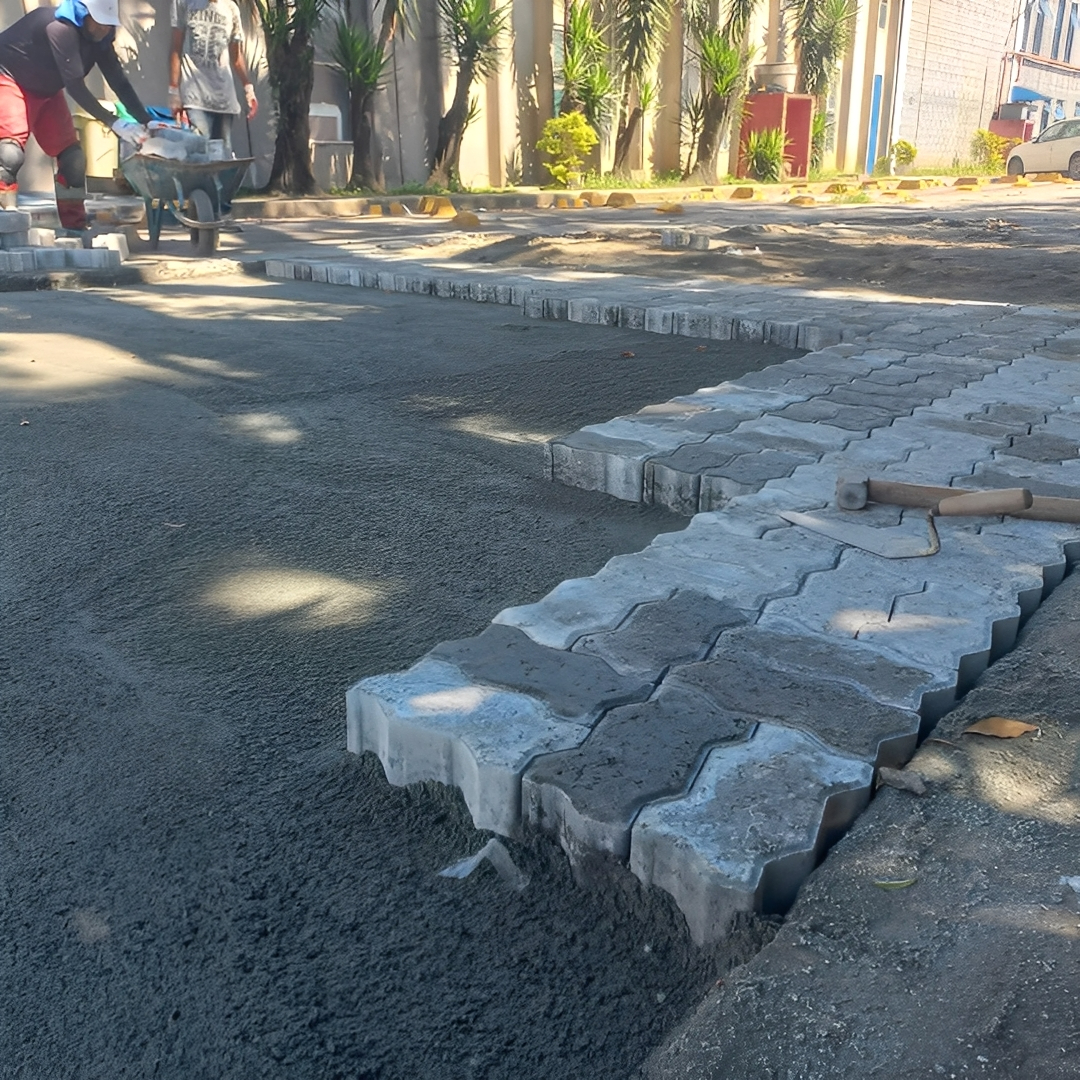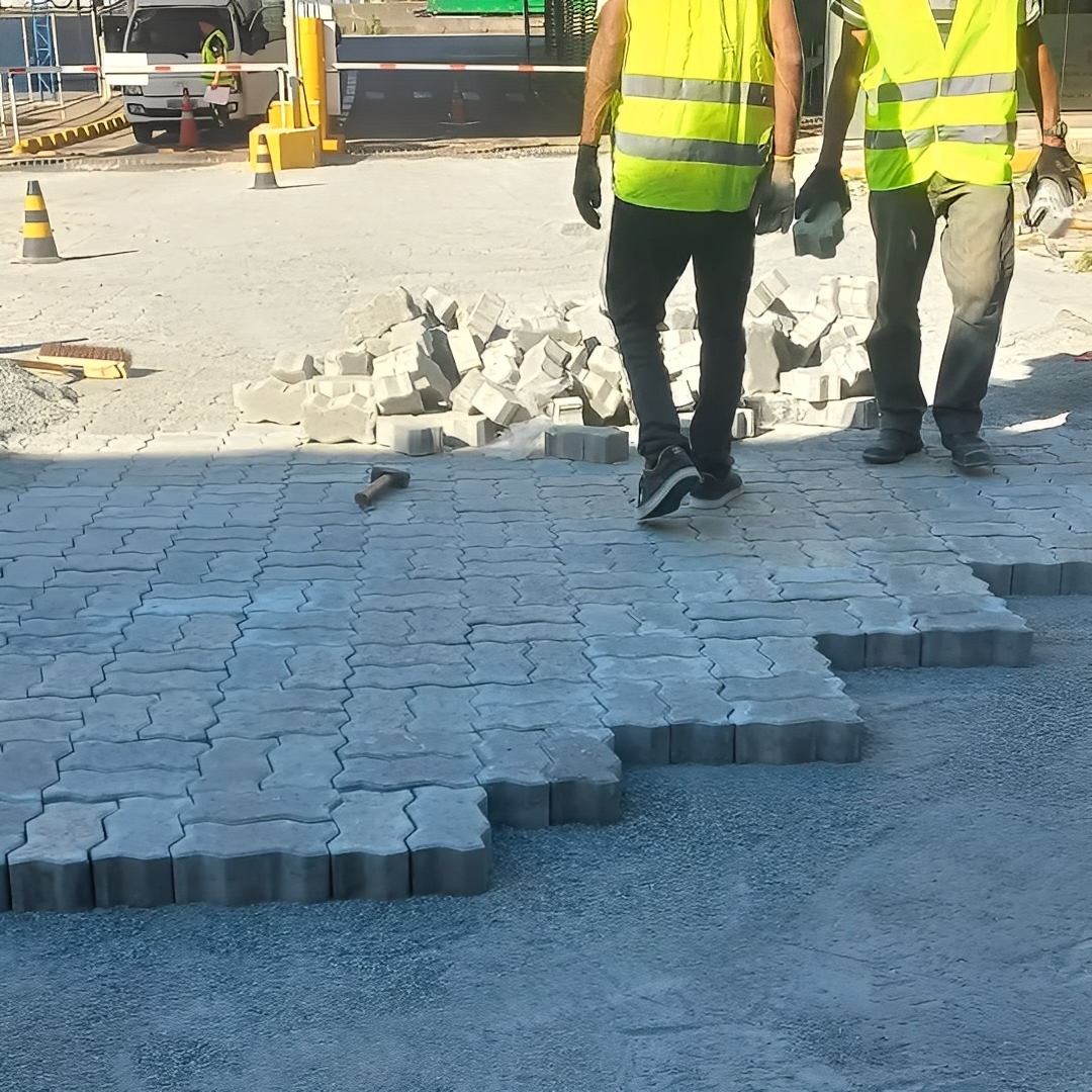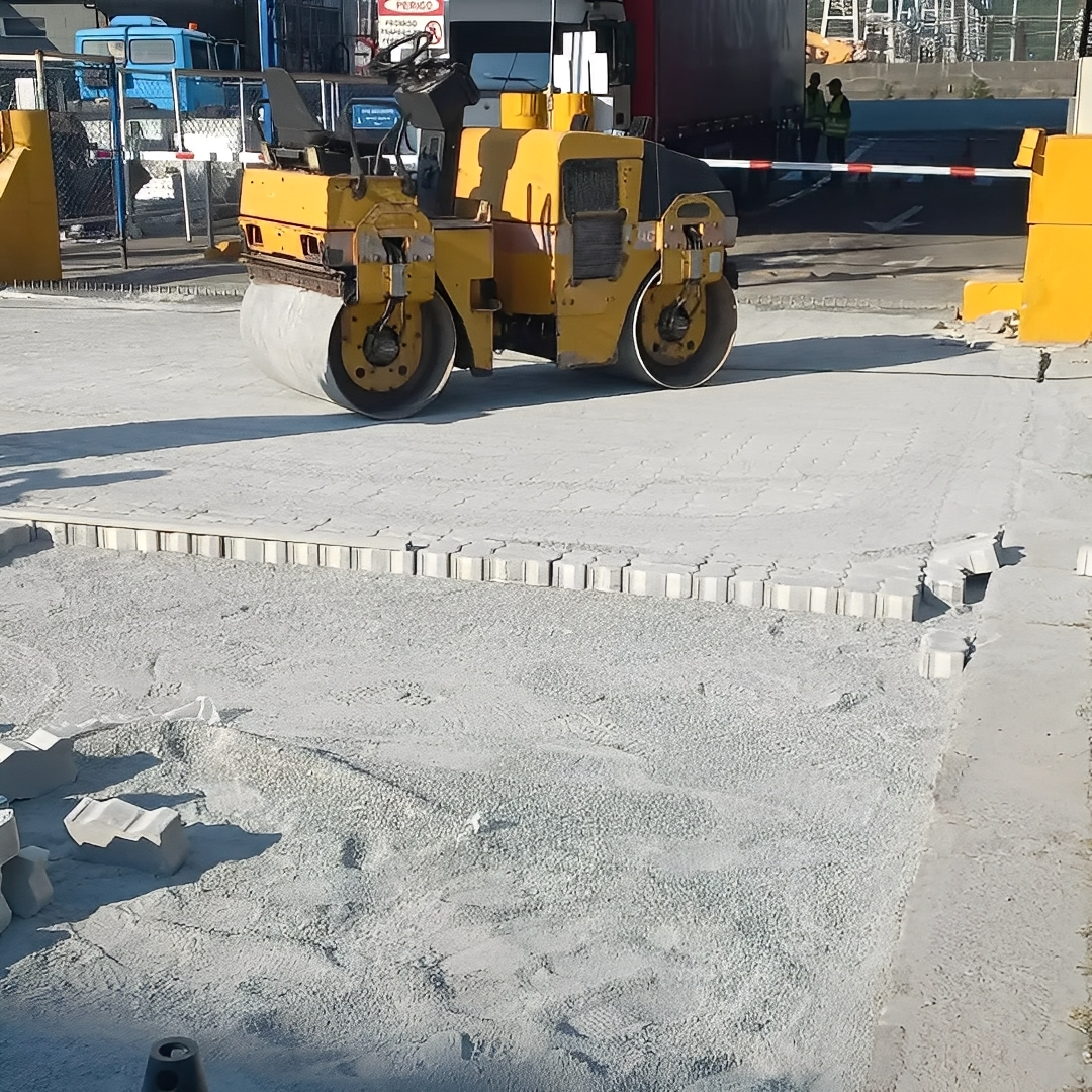 SERVIÇO DE PAVIMENTAÇÃO PERMEÁVEL – CONJUNTO COMERCIAL CHINA HAY GUARULHOS: Preparação Base com B.C. Bica Corrida e colocação piso intertravado na cor natural conjunto de galpões comerciais para transportadoras – devidamente compactada com rolo compactador.